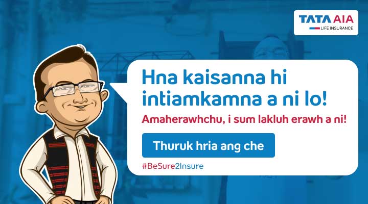 Tata AIA Life Insurance Company Limited (IRDAI Regn. No.110) CIN: U66010MH2000PLC128403. Pisa pui ber: Chhawng 14-na (14th Floor), Tower A, Peninsula Business Park, Senapati Bapat Marg, Lower Parel, Mumbai - 400013. Sumdawnna atana hman tur chhinchhiahna achunga tarlan khi Tata Sons Ltd and AIA Group Ltd. te ta a ni a, phalna neiin Tata AIA Life Insurance Company Ltd. ten an hman a ni. Hriattirna engpawh, sût lailawkna te, claim leh lungawilohna a awm a nih chuan kan Insurance Advisor / Intermediary te bepawp thin la, emaw i hnaih ber Tata AIA Life branch office pan thin ang che emaw 1-860-266-9966 (tualchhunga inbiakna man ang hman a ni) be pawp ang che, emaw customercare@tataaia.com ah hian ziakin min thawn thei ang. www.tataaia.com ah hian min tlawh dawn nia