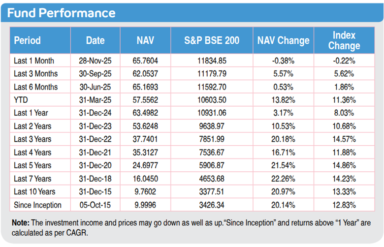 15-year computed NAV for Multi Cap Fund as of December 2025. Other funds are also available. Benchmark of this fund is S&P BSE 200.