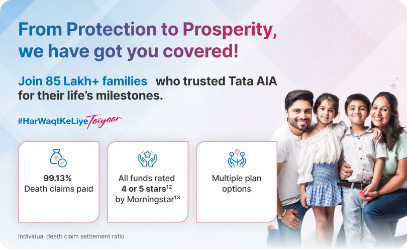 • # मौजूदा इनकम टैक्स कानूनों के मुताबिक, इनकम टैक्स के लाभ मिलेंगे, बशर्ते कि उसमें निर्धारित शर्तें पूरी की जाएं. इनकम टैक्स कानून समय-समय पर बदलाव के अधीन है. टाटा एआईए लाइफ इंश्योरेंस कंपनी लिमिटेड इस दस्तावेज़ में कहीं भी बताए गए टैक्स संबंधी प्रभावों की ज़िम्मेदारी नहीं लेती है. आपको मिलने वाले टैक्स बेनिफिट्स के बारे में जानने के लिए, कृपया अपने टैक्स सलाहकार से परामर्श करें.