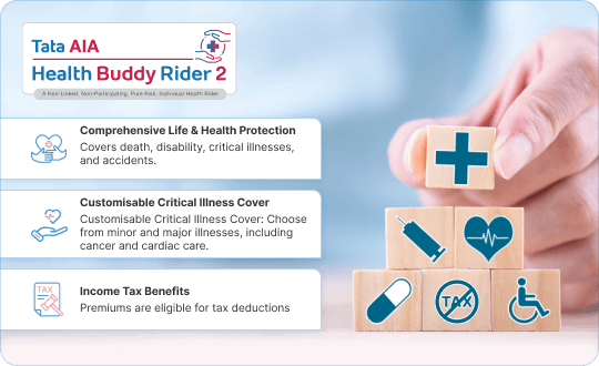 Holistic Financial Shield: You can add the health rider to avail of comprehensive protection for you and your family. It helps cover multiple life challenges such as death, critical illness, or disability. This all-in-one support system ensures that you are financially prepared for life’s unexpected events, offering peace of mind during tough times.