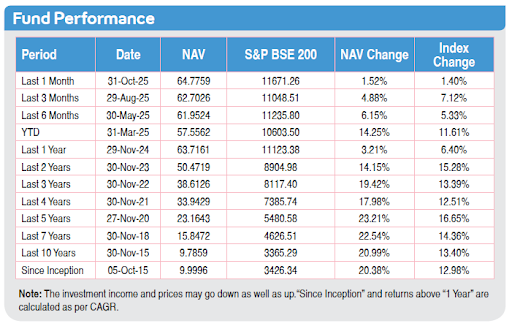 • 45-year computed NAV for Multi Cap Fund as of November 2025. Other funds are also available. Benchmark of this fund is S&P BSE 200.