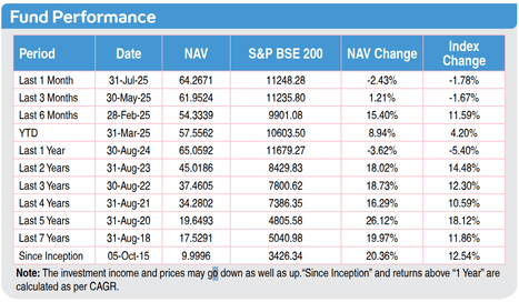 25-year computed NAV for Multi Cap Fund as of August 2025. Other funds are also available. Benchmark of this fund is S&P BSE 200.