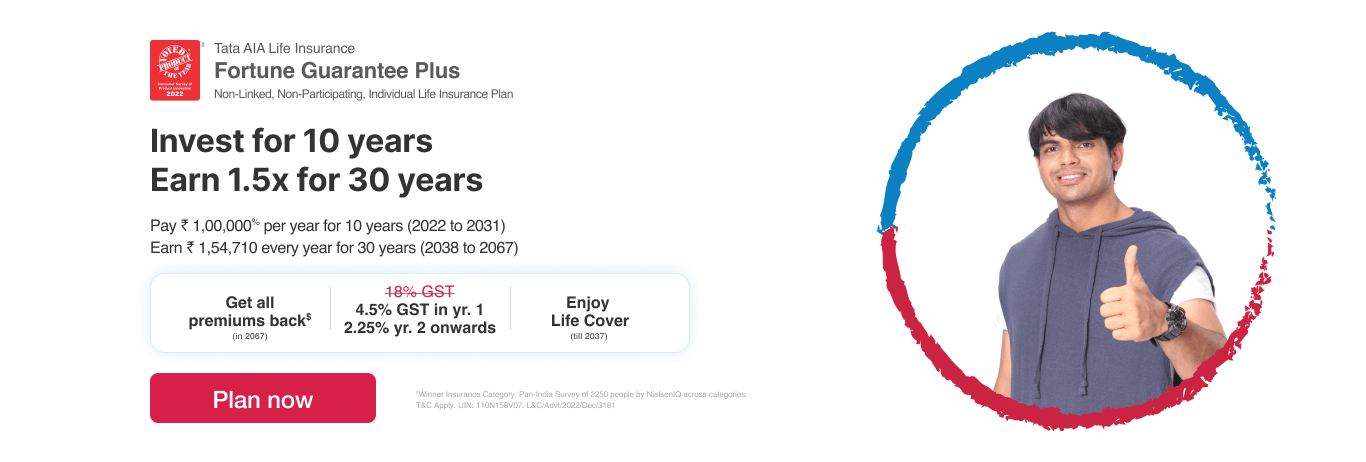 • The complete name of Tata AIA Fortune Guarantee Plus is Tata AIA Life Insurance Fortune Guarantee Plus (UIN: 110N158V07) - Non-Linked, Non-Participating, Individual Life Insurance Savings Plan.
